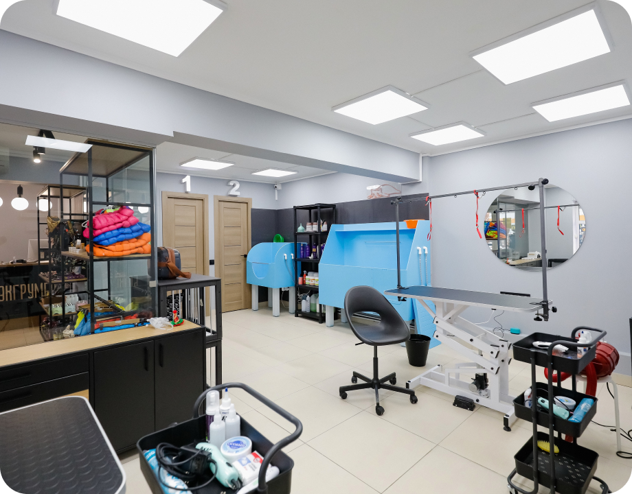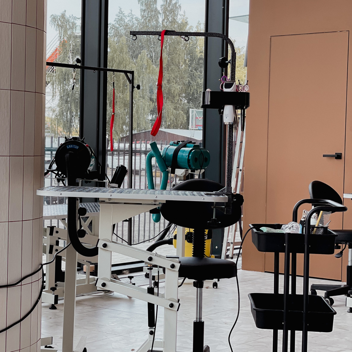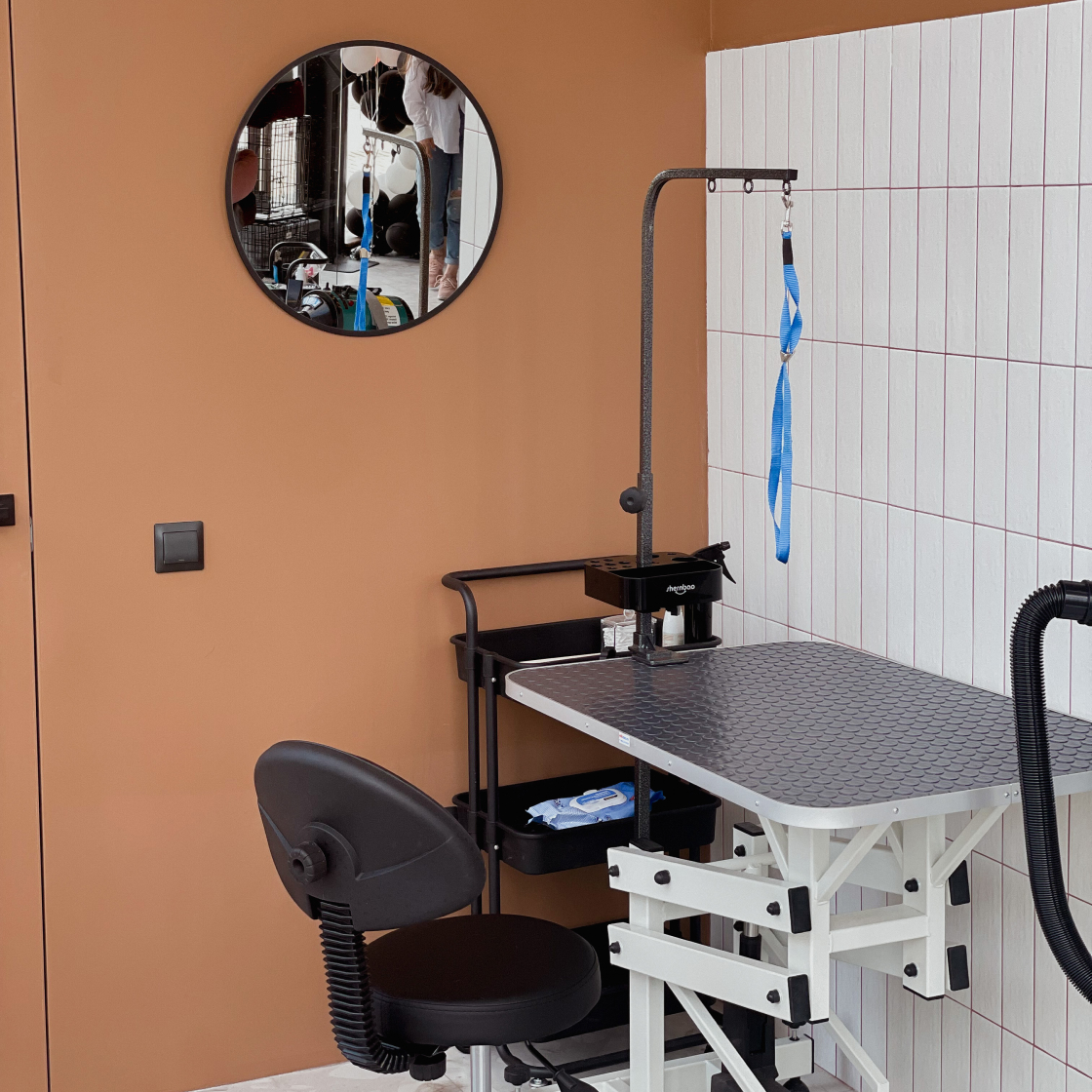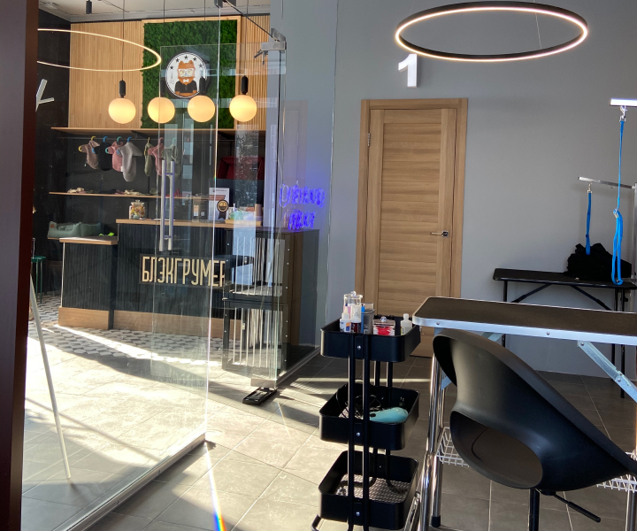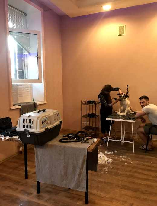 Спустя месяц мы открыли наш первый салон, это было уютное цокольное помещение. Машинку для стрижки мы купили на Авито, стол для груминга сделали сами: постелили резиновое покрытие на стол из Икеи. Мыли собак в туалете, там была душевая лейка.
